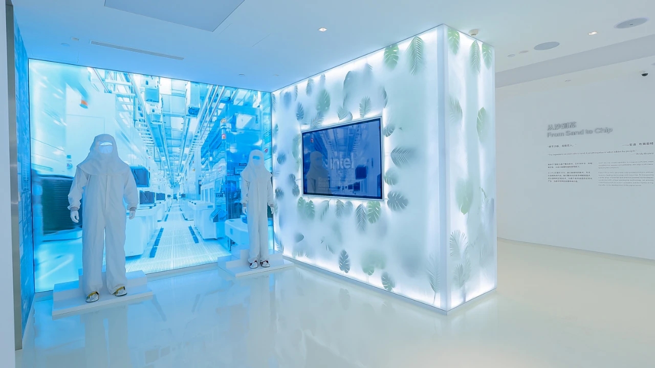 英特尔GTC科技体验中心共有六大展览区域:发展历程、制造技术与英特尔代工、AI PC应用、数字化转型智能应用体验、生态合作伙伴产品与解决方案和科技向善。